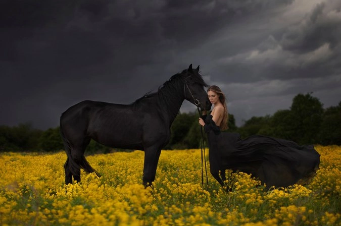 Девушка в черном с черным конем в цветущем рапсе симпатично! По типу "Гроза надвигается".
