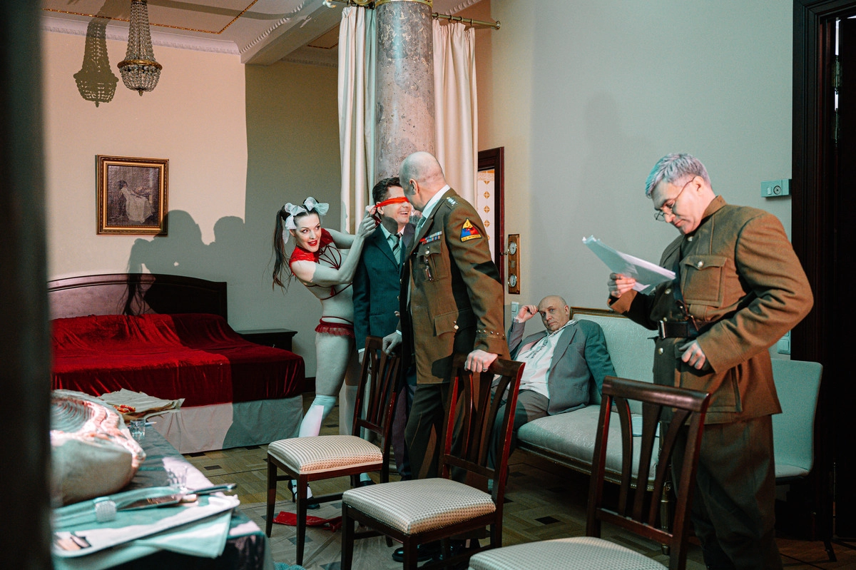 В некоторых номерах происходили театральные мини-представления с участием настоящих актеров. Например, в одной комнате главы ведущих мировых держав конца 40-х годов разделывали натуральную свиную тушу, названную Европой, под стриптиз грудастой девушки. Лично мне в свете текущих геополитических событий предложили съесть кусочек Чехии, но я отказался.