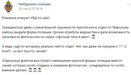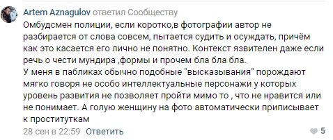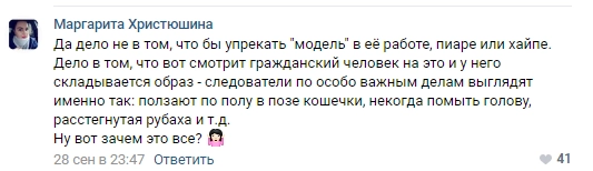 В сообществе правоохранителей «Омбудсмен полиции» выходку студентки не оценили. Подписчики сочли, что Алина опошлила образ следователя по особо важным делам, изобразив его гламурной красоткой, «ползающей в позе кошечки».