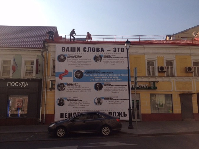 Стоит отметить, это далеко не первая акция арт-сообщества, посвященная «Открытой России». Ранее отчаянные активисты «Главплаката» вывесили напротив столичного офиса организации Ходорковского огромный баннер с надписью «Ваши слова — это ненависть и ложь».