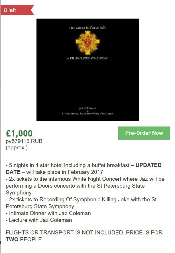 Симфонический альбом британские рокеры запишут в феврале будущего года в Санкт-Петербурге, и за 1000 фунтов предлагают целый набор впечатлений. В эту сумму входят 5 ночей в четырехзвездочном отеле, два билета на концерт «Белые ночи», на котором клавишник Джез Коулмен с государственным симфоническим оркестром отыграет концерт, состоящий из песен The Doors.