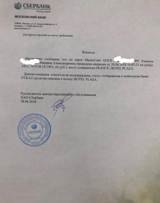 «Забронировала через Booking отель в Италии. Каково было мое удивление, когда 26.06.2018 с заблокированной карты Сбербанка, на балансе, которой был 0, с меня списали 5500 евро из отеля Франции. Отель Plaza! Конечно, сразу обратилась в полицию, ведётся расследование, опротестовала операцию в банке. Узнала у банка, что именно этот отель с меня незаконным путем списал такую сумму. Booking правда, неоднократно просил отель, вернуть сумму, но какие могут быть просьбы, когда на лицо мошеннические действия», — рассказала Марина.