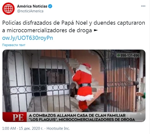 Так, 10 декабря в Перу во время операции по задержанию наркоторговцев на окраине Лимы переодетые полицейские выбили дверь и арестовали главу банды Los Flaquis и четверых его подручных.