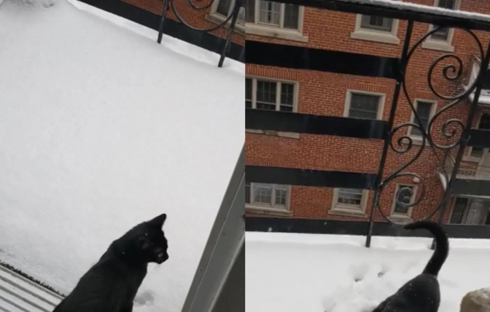Чёрный котик из ролика никогда его раньше не видел, и белые хлопья на балконе для него стали настоящим сюрпризом. Сначала он их осторожно нюхает и трогает лапкой, затем решает по ним пройтись. Гуляя по первому снегу, пушистик, кажется, пережил весь спектр чувств, от удивления до искренней радости.