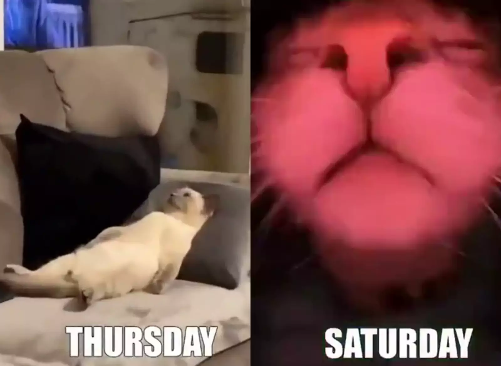 Многие, кому знаком график 5\2, тяжко переживают понедельники и чувствуют томное ожидание каждую пятницу. А уж в субботу... Именно эти ощущения и показали коты в этом видео.