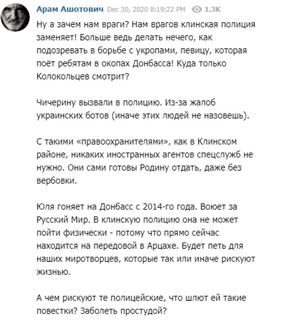 В самой повестке причина вызова на допрос не уточняется. Однако, судя по комментариям певицы и ее знакомых, полиция заинтересовалась Чичериной из-за «жалоб украинских ботов».