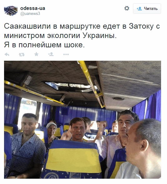 Назначенный глава Одесской области Михаил Саакашвили решил отказаться от охраны и приехал на открытие пляжа в курортном городке Затока на обычном рейсовом автобусе. Вместе с ним в общественном транспорте находился министр экологии Украины Игорь Шевченко и постпред Эстонии в Украине Сулев Каннике.