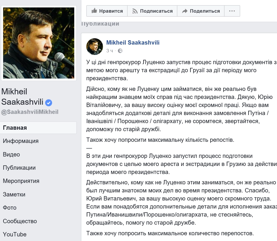 Политик написал на своей странице в Facebook, что процесс подготовки документов для его ареста и экстрадиции в Грузию начал генеральный прокурор Украины Юрий Луценко.