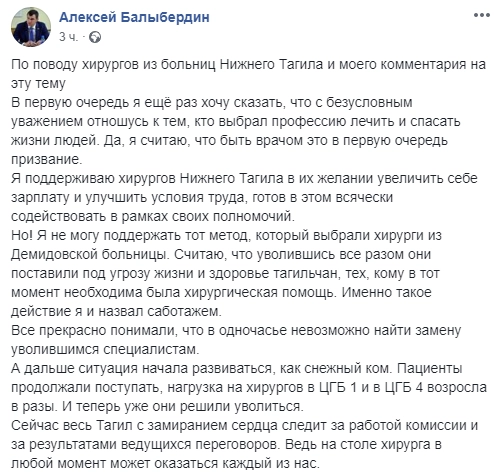 Депутат Государственной думы РФ Алексей Балыбердин, избранный от Нижнего Тагила, выступил на своей странице в Facebook, объяснив свое отношение к хирургам, массово увольняющимся из городских больниц. Ранее парламентарий обвинял врачей в саботаже, подчеркнув, что в первую очередь они должны были подумать о своих пациентах.