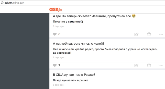 В частности, в социальной сети Элина признается, что «при одной мысли о Москве ей становится дурно», а на вопрос одного из пользователей «Где лучше, в США или в Рашке?» Элина ответила категорично: «Везде лучше, чем в Рашке».