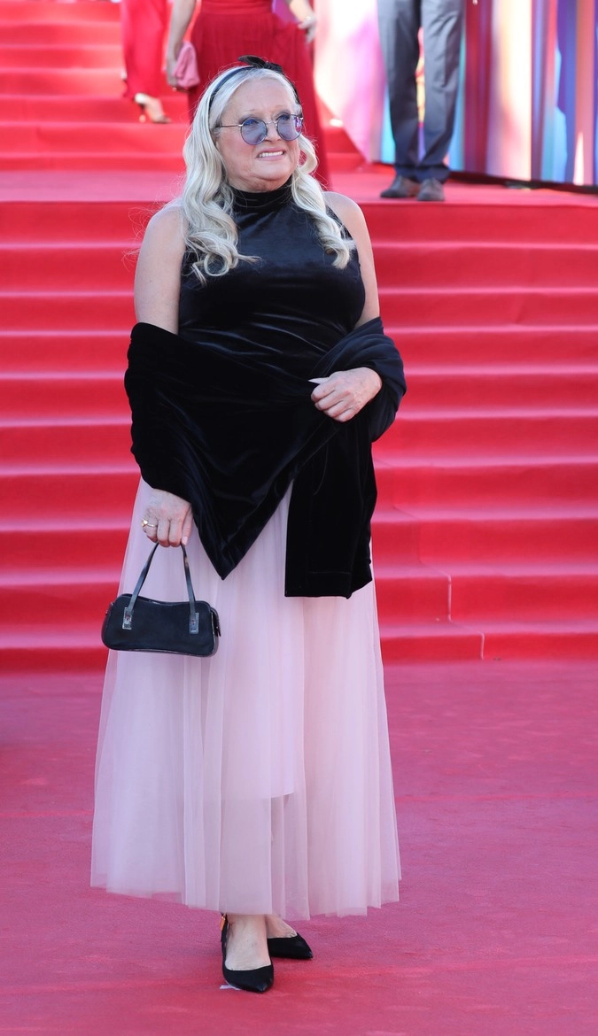 А супруга Никиты Михалкова, президент благотворительного фонда «Русский силуэт» Татьяна Михалкова выбрала для красной дорожки бархатный черный топ и светлую шифоновую юбку в сочетании с неизменным ободком-бантиком.