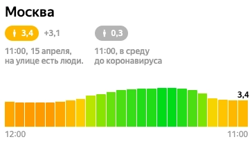 Средний индекс самоизоляции в Москве на сегодняшний день составляет 3,4. Алгоритм «Яндекса» рассчитывает индекс по шкале от 0 до 5: чем выше значение индекса, тем лучше люди соблюдают самоизоляцию (от 0 — «‎на улицах много людей» до 5 — «‎все сидят по домам»). Соответственно, на улицах столицы «много людей».