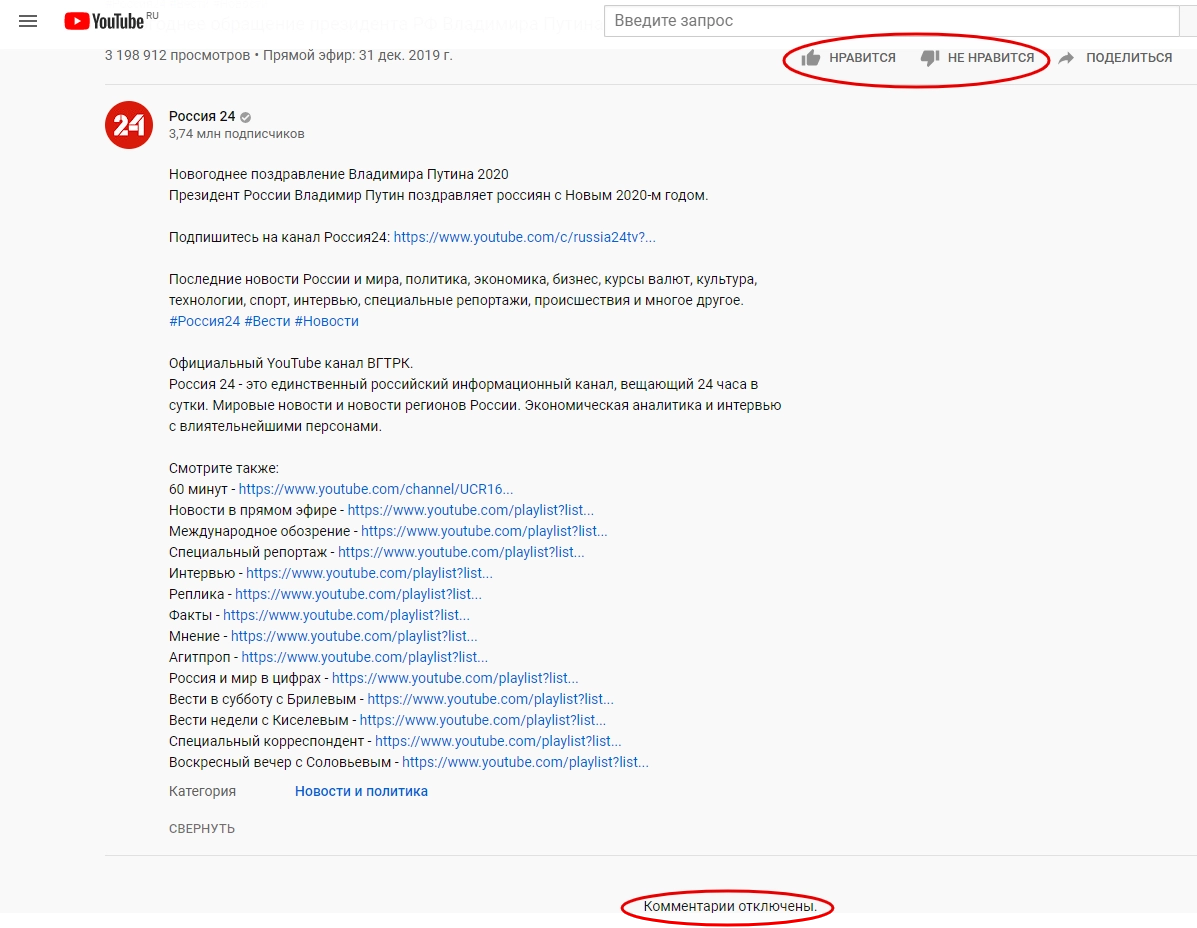 Ранее во время трансляциями итоговой пресс-конференции Владимира Путина 19 декабря 2019 года было зафиксировано массовое количество дизлайков и негативных комментариев. Администрация русскоязычного YouTube официально признала случившееся кибератакой — уж очень подозрительно выглядели «чистенькие и свежие аккаунты с подозрительными именами» в комментариях и ровные цифры дизлайков.