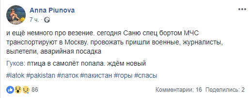 «Сегодня Саню спец бортом МЧС транспортируют в Москву. Провожать пришли военные, журналисты. Вылетели, аварийная посадка. Гуков: птица в самолёт попала, ждём новый», — написала она.