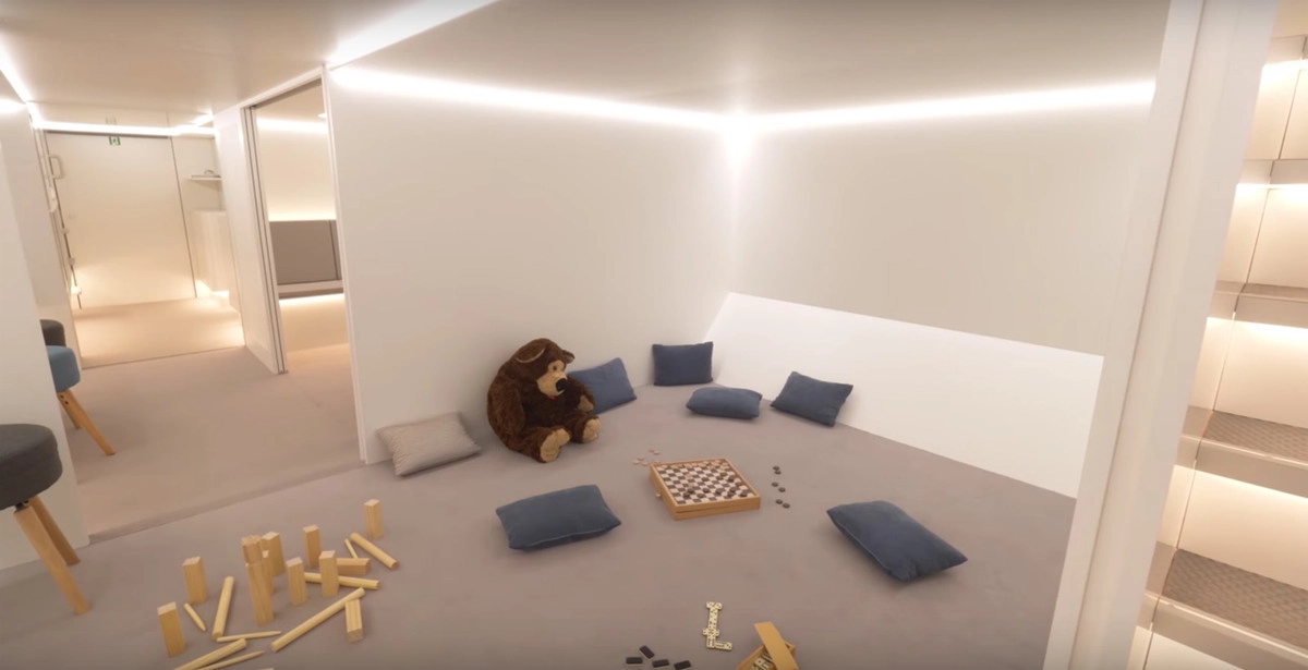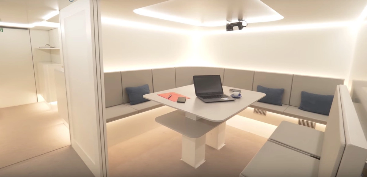 Часть помещений воздушного судна компания предложила использовать как рабочее пространство или игровую для детей. В дополнительном «модуле конференц-зала» будут установлены кресла и столы для рабочих встреч. Проектор позволит пассажирам проводить презентации или смотреть фильмы на большом экране.