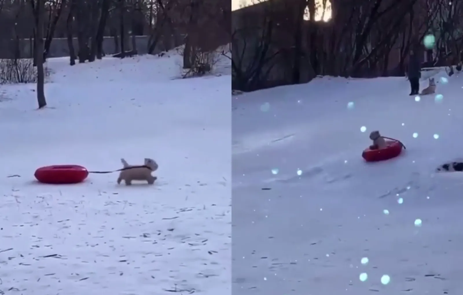 Но этот милый крошечный пёсик просто-напросто сломал систему, самостоятельно затащив в зубах тюбинг на горку и устроив себе покатушки.