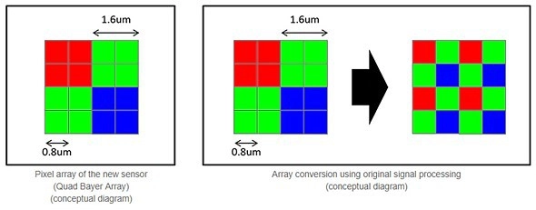 Также пиксели умеют объединяться в группы по четыре и работать совместно — тем самым повышается качество съемки при недостаточном освещении. Технология называется Tetracell и основана на нетипичном устройстве цветового фильтра — фотодиоды одного цвета расположены в группах 2*2.
