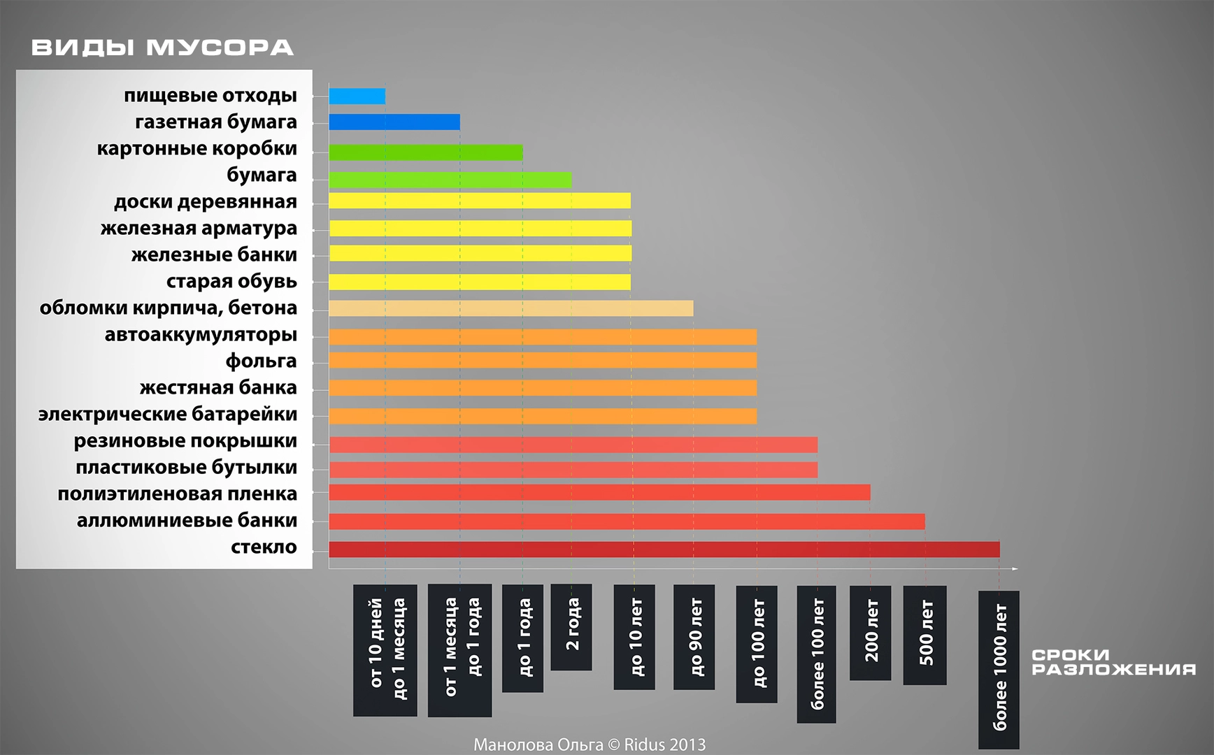 Представленная инфографика наглядно демонстрирует, какие из бытовых отходов самые опасные, какие - чуть менее, а главное, сколько времени они разлагаются...