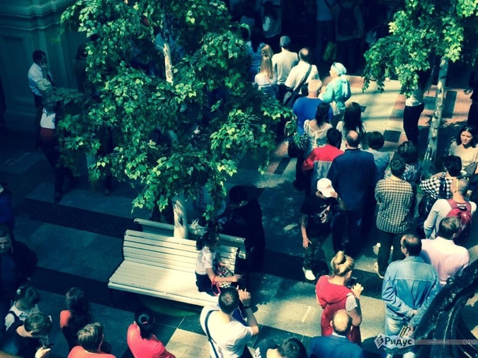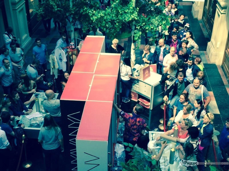Гигантские очереди образовались в столичном ГУМе 11 и 12 июня: желающие приобрести футболку или чехол на «iPhone» с изображением Владимира Путина от российских дизайнеров Анны Трифоновой и Ивана Ершова буквально смели партию из пяти тысяч футболок с прилавков. Организаторам приходится констатировать: запланированные на три для (с 11 по 13 июня) продажи будут окончены раньше.