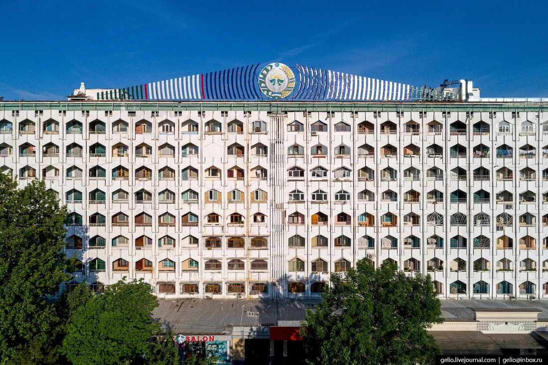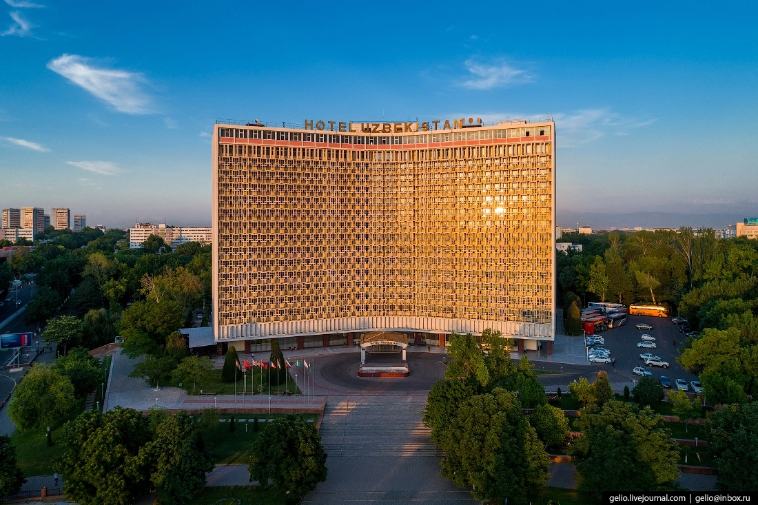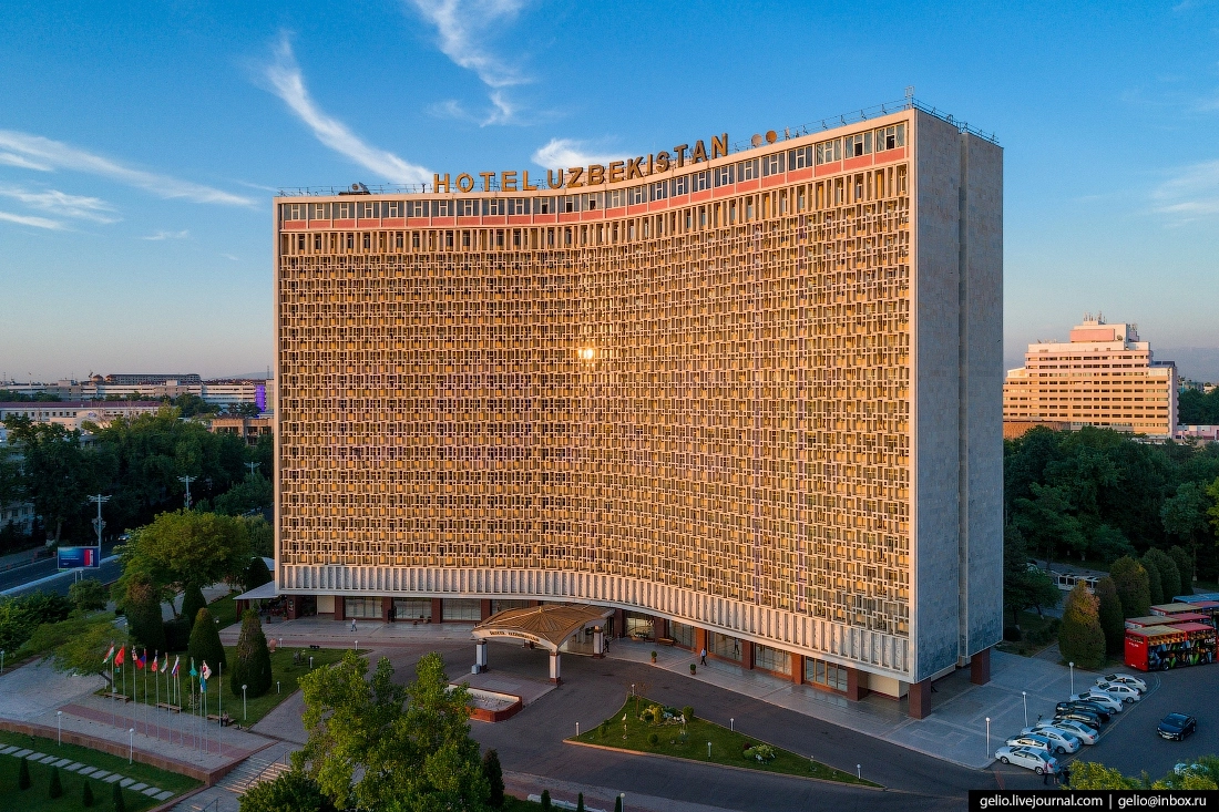 Гостиница «Узбекистан», построенная в 1974 году. Она до сих пор остаётся одной из самых известных и узнаваемых гостиниц в Ташкенте. В 17-этажном здании расположены жилые номера, два ресторана и бара, конференц-залы и SPA-центр.