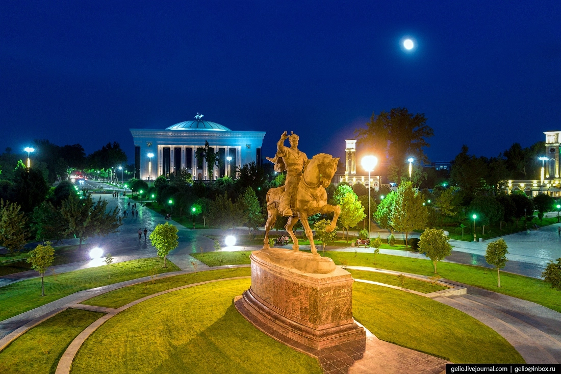 Памятник Амиру Темуру. Бронзовый монумент одному из основателей узбекской государственности открыли в 1993 году. Тамерлан изображён сидящим на коне в полном походном облачении. На постаменте выгравировано имя правителя и его девиз «сила в справедливости».
