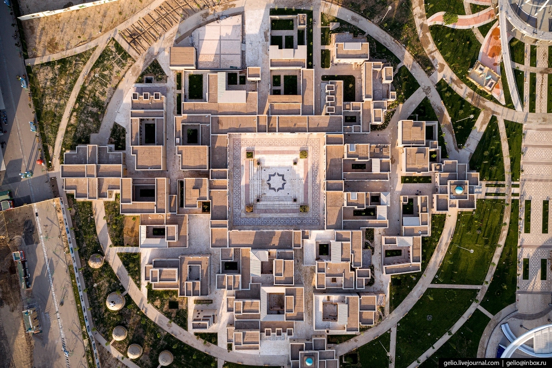 Фасад украшен врезками с восточным орнаментом и изображением солнца, а купол дворца диаметром 53 метра венчает скульптура аистов, символизирующих мир и счастье.