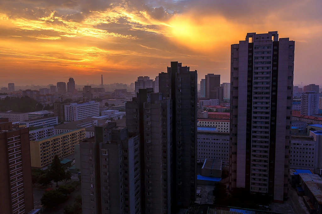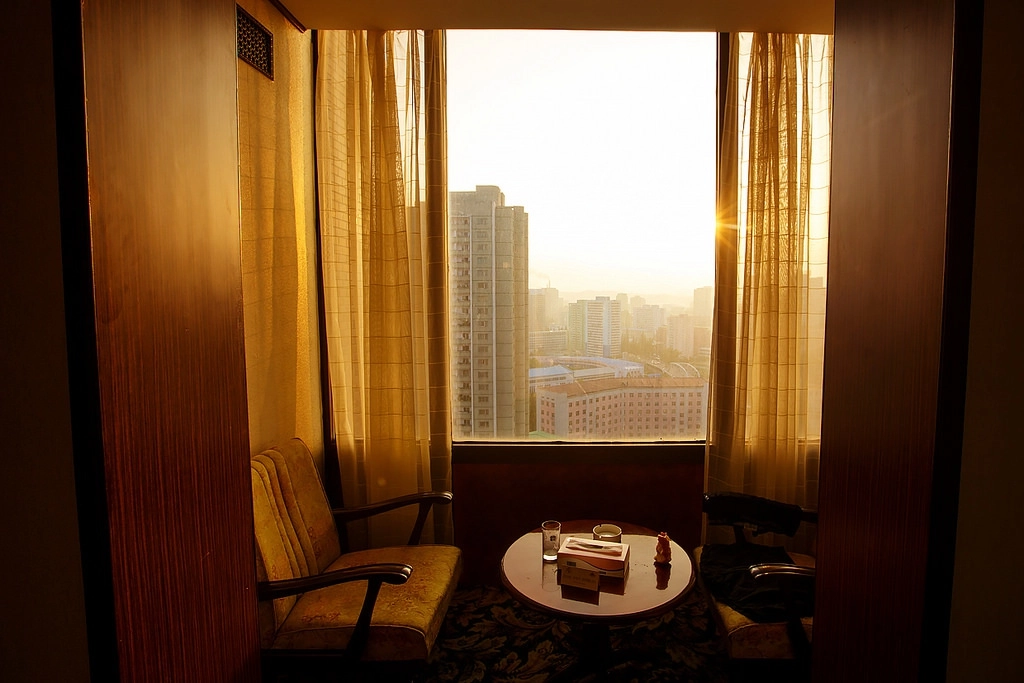 Из окон открывается замечательный вид на высотки Пхеньяна, на пешеходные улицы, железную дорогу, университет. Панорама уходит далеко за горизонт, снимай сколько хочешь. Собственно, это мы периодически и делали.