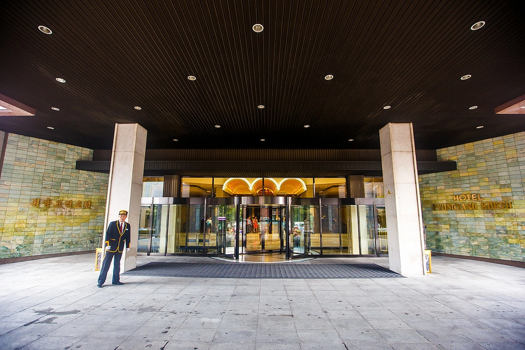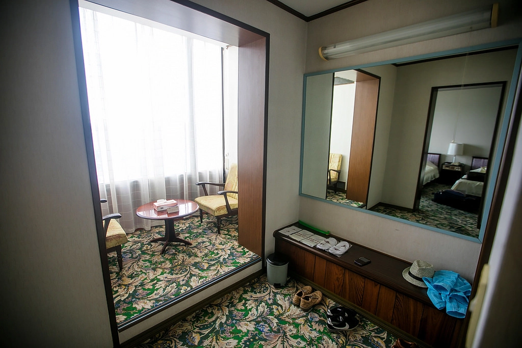 На входе наши автомобили встречает швейцар, северокорейский швейцар. Он сам открывает багажник, сам достает сумки, сам отвозит на тележке их к номеру. Даже кнопку лифта за вас нажимают.