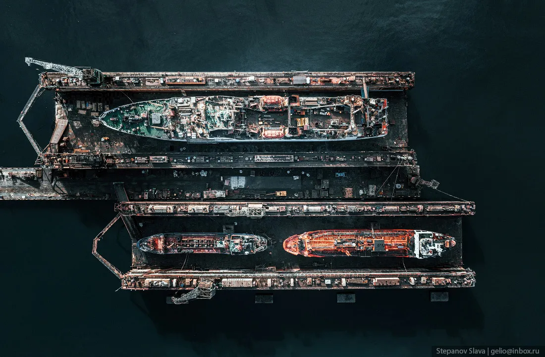 7. Плавучие доки на заводе используют, чтобы поднять судно из воды для ремонта и обслуживания. По форме док напоминает огромный ящик, в котором находится корабль. В конструкции используются балластные цистерны. Когда док подходит к кораблю, в них закачивают воду — и конструкция притапливается. После этого судно фиксируют, откачивают воду из цистерн — и док поднимается вместе с кораблём. Процесс называется докованием.