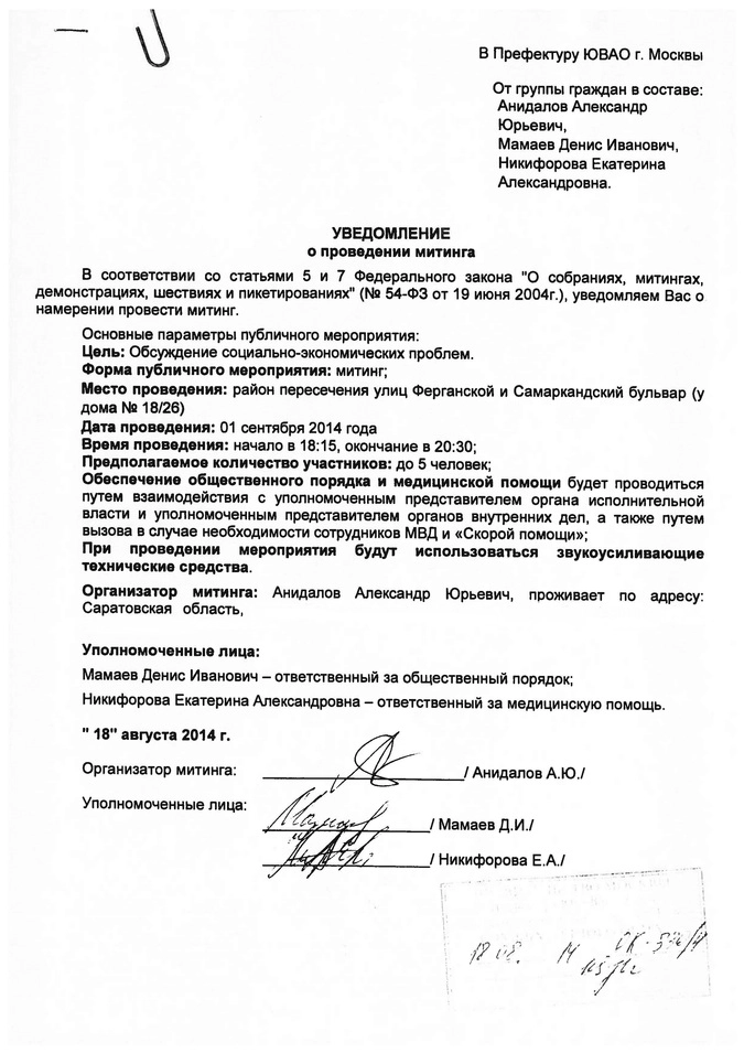 Заявка на митинг в поддержку Андрея Клычкова, организатором которого выступил Александр Анидалов