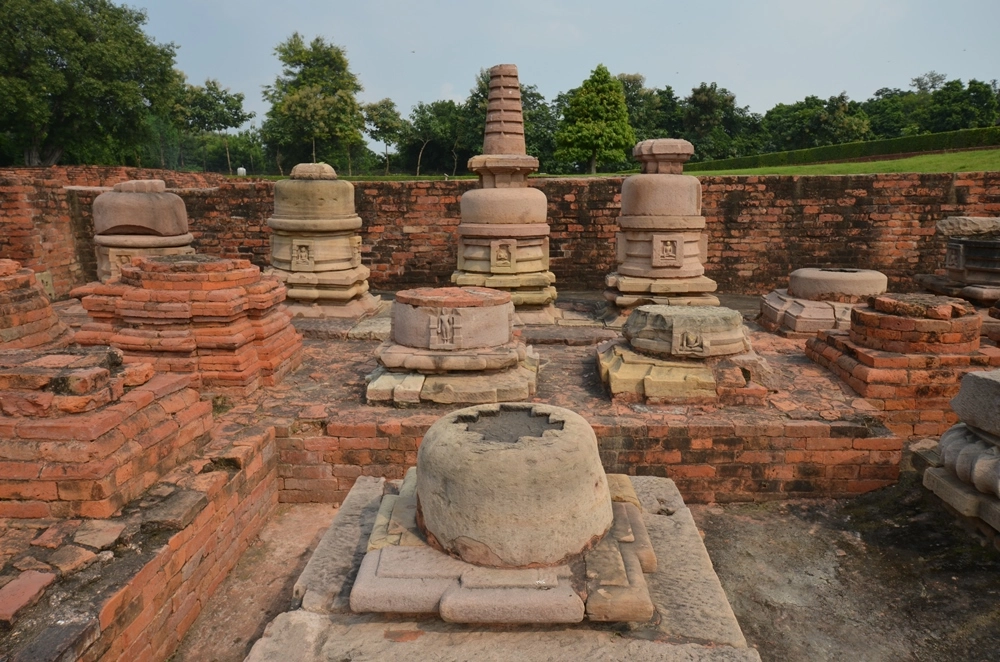 Ступа Дхамек и десятки окружающих её небольших буддийских ступ.