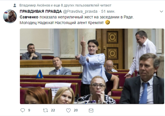 Народный депутат Надежда Савченко показала своим коллегам в Верховной раде неприличный жест. Что послужило причиной столь спонтанного поступка, пока не известно.