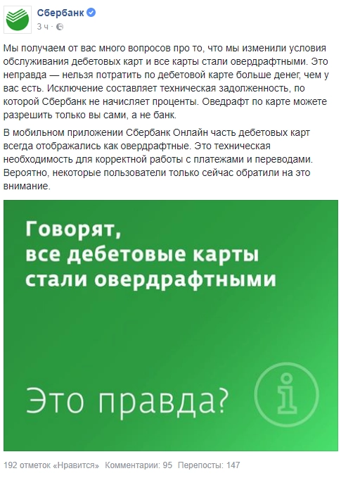 В кредитной организации пояснили, что в мобильном приложении «Сбербанк Онлайн» часть дебетовых карт всегда отображались как овердрафтные. По сообщению банка, это необходимо для корректной работы с платежами и переводами.