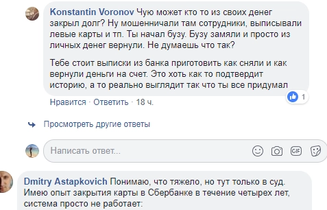 Карточку в Хабаровске и долг по ней они видят, она существует и по-прежнему оформлена на мое имя. То есть все выглядит так, будто в 2013 году карту из системы не удалили. Просто как-то «вручную» вернули мне деньги, заморозив проблему, но не решив ее, — сообщил Росляков.