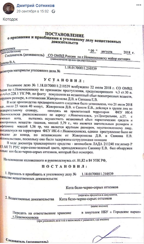 Однако схему отправителя и Долгинцева раскрыла полиция. Кота же признали вещдоком и отдали на передержку.