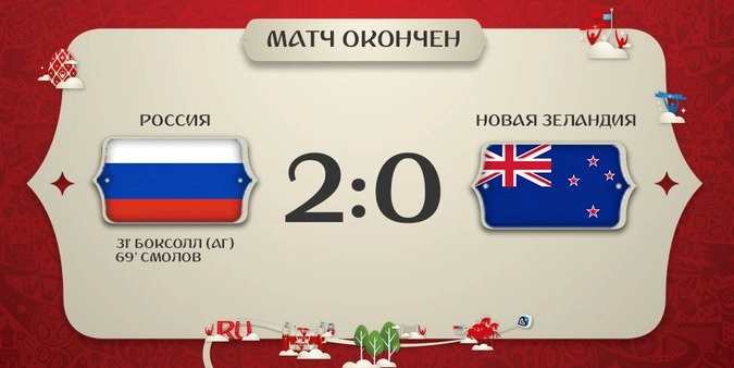 Счет открыл автогол — на 31-й минуте, после удара российского полузащитника Дениса Глушакова, мяч попал в штангу. После несколько игроков новозеландской команды пытались его выбить, а Глушаков — добить в ворота.