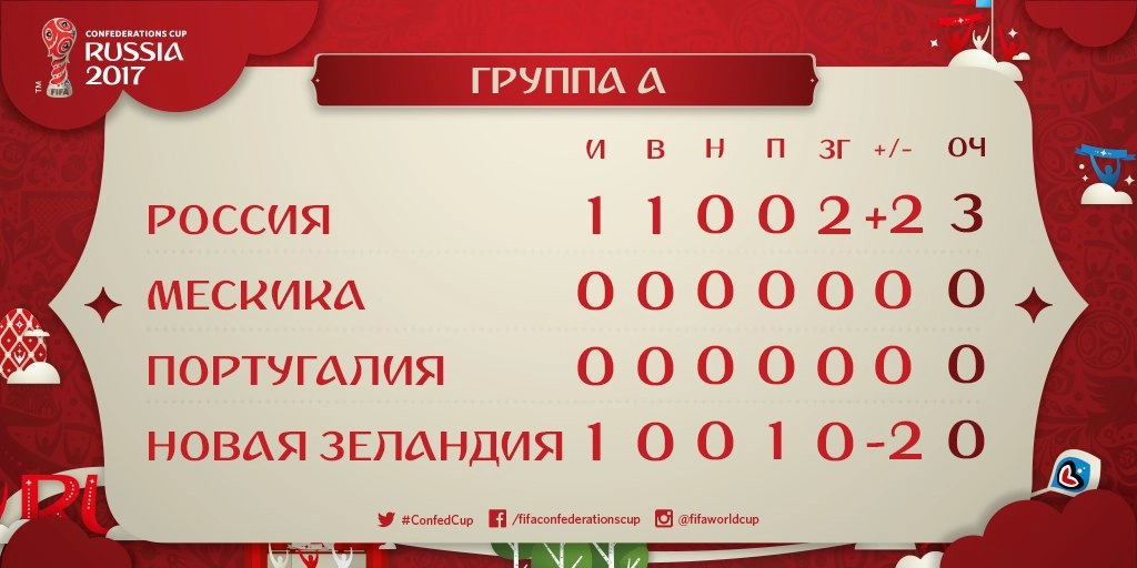 Кубок конфедераций проходит в России. Кроме Москвы и Санкт-Петербурга матчи турнира пройдут в Казани и Сочи. В группе A вместе со командами России и Новой Зеландии выступают Мексика и Португалия, а в группе B — Германия, Чили, Австралия и Камерун.