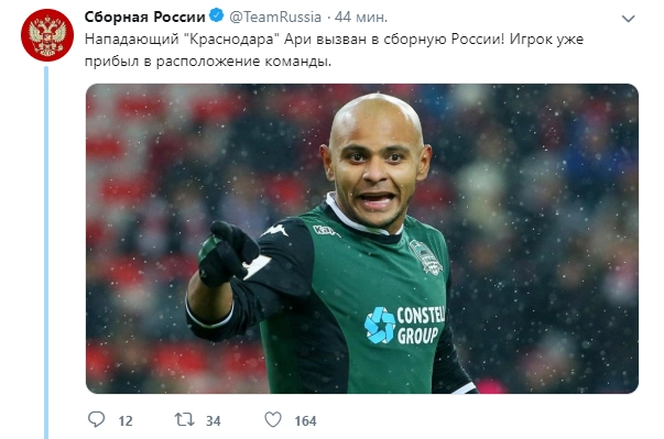 Бразильский нападающий «Краснодара» Ари, получивший в июле российский паспорт, вызван в сборную России.