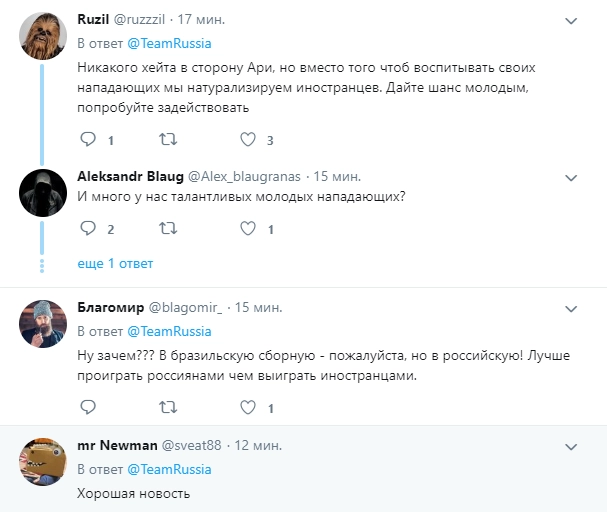 В Сети мнения по поводу включения Ари в сборную России разделились. Один из пользователей считает, что нужно воспитывать своих нападающих и давать шанс молодым. Другой же назвал эту новость хорошей.