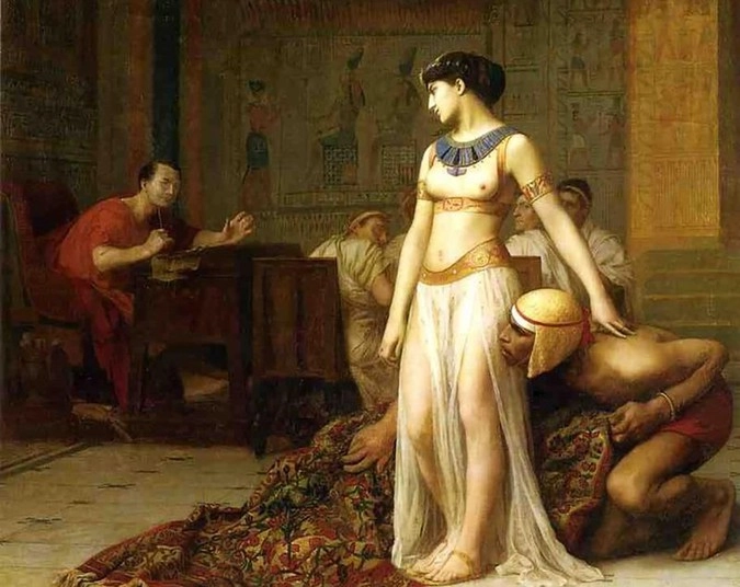 Цезаря она влюбила в себя хитростью: облачившись в самые красивые наряды, она приказала слугам завернуть её в ковер и принести в подарок Цезарю. Зная тонкости всех существовавших на тот момент любовных утех Древнего мира, Клеопатра, поразила избалованного императора изобретательностью и тонким чувством юмора. Её движения и голос буквально околдовали Цезаря. Юлий, в ту же ночь он стал её любовником. Таким образом, Клеопатра заплатила огромный государственный долг, получила египетский трон и любовь великого полководца. Но римляне не смогли простить ему любовных отношений с египтянкой, и в результате коварного заговора Цезарь был убит.