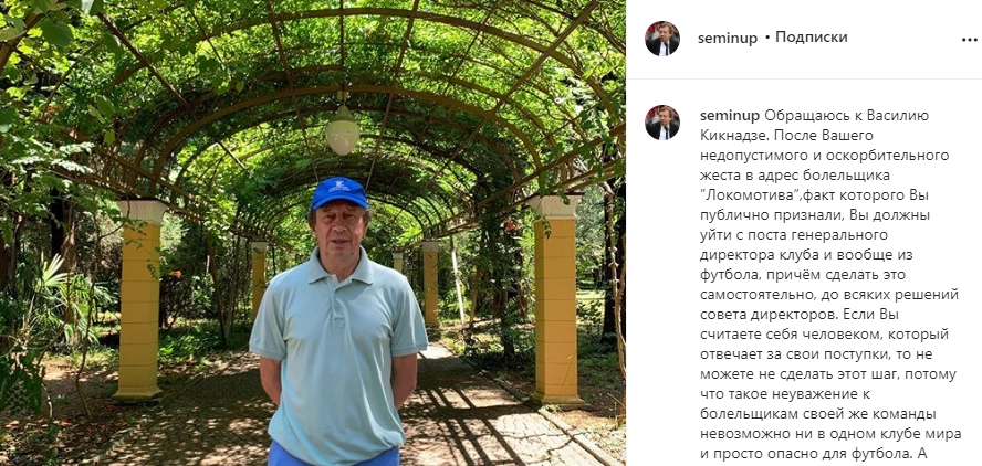 Бывший главный тренер футбольного клуба «Локомотив» Юрий Семин опубликовал в своем Instagram-аккаунте пост, в котором предложил генеральному директору клуба Василию Кикнадзе покинуть пост после инцидента со средним пальцем в адрес болельщика в минувшие выходные.