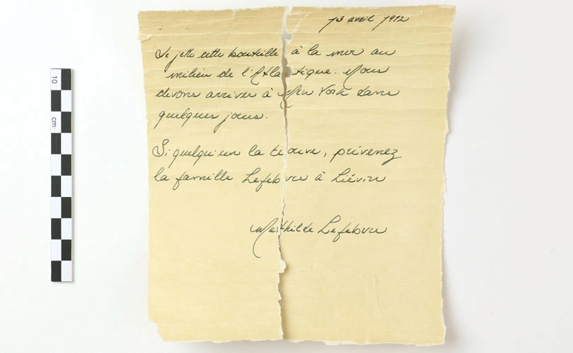 Я бросаю эту бутылку в море посреди Атлантики. Мы должны прибыть в Нью-Йорк через несколько дней. Если кто-нибудь найдет письмо, сообщите об этом семье Лефевров в Льевене, — говорится в письме.