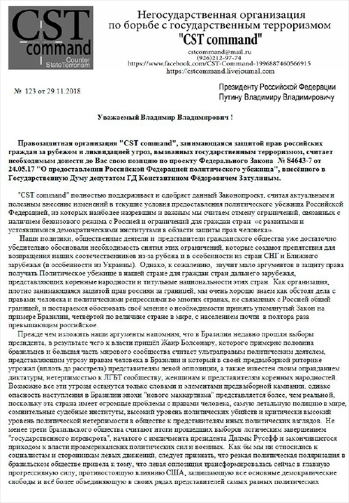 «И свое обещание мы сдержали, — говорит директор российского бюро CST command Артемий Семёновский, — уже через два дня президент Путин принял новую Концепцию государственной миграционной политики, а еще через месяц, после направления нами обращения президенту и в профильные комитеты Госдумы, президентским Указом № 731 от 19.12.2018 г. были сняты ограничения на получение политического убежища гражданами Бразилии, как и гражданами всех тех стран, с которыми у России имеется соглашение о безвизовом режиме (ранее граждане „безвизовых“ стран не могли претендовать на политическое убежище в нашей стране)».