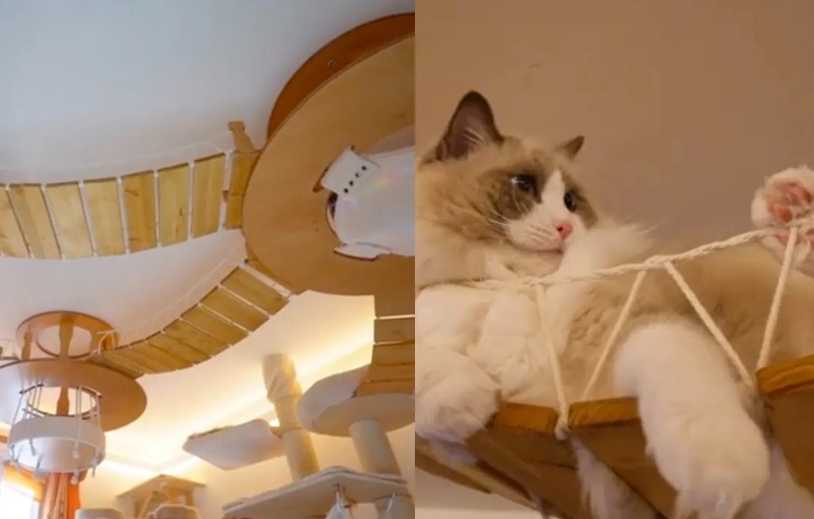 Пользовательница видеохостинга Rumble из Франции, известная под ником MerlinandNerina, и ее мама нашли оригинальное решение проблемы нехватки спальных мест для своих пяти кошек. Они создали для питомцев настоящий рай с подвесными лежанками, домиками, лесенками и мостиками в самом высоком месте дома — под потолком.