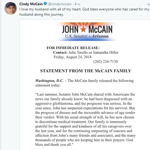 Члены семьи поблагодарили всех, кто поддерживал Маккейна.