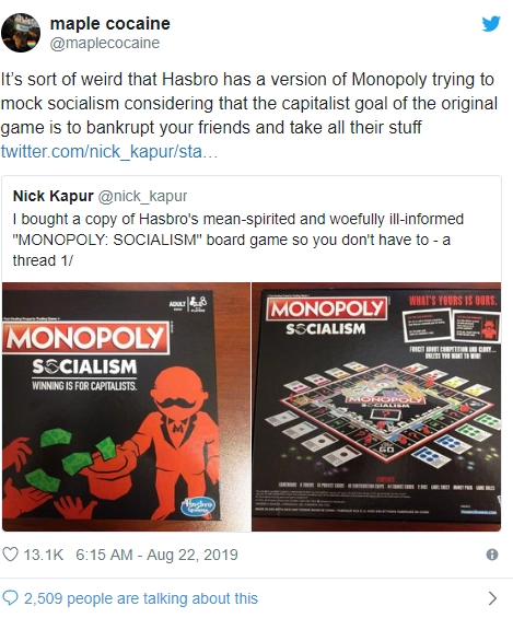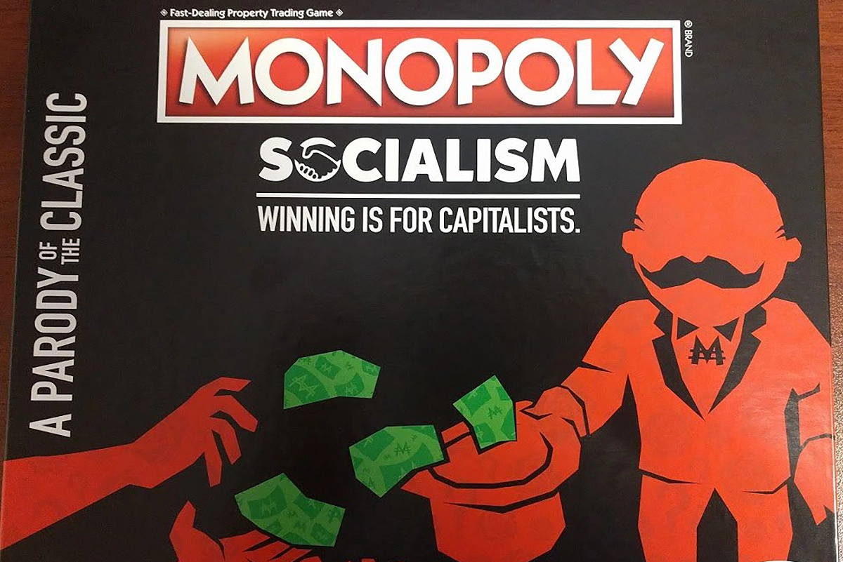 Компания Hasbro — один из крупнейших мировых производителей игрушек — выпустила новую версию классической настольной игры «Монополия» под названием «Монополия: Социализм». Игра задумывалась как сатира на современное западное левое движение, это можно заметить уже из слоганов на упаковке: «Было ваше — стало наше» и «Побеждать — это для капиталистов».