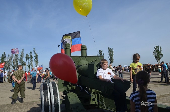 Люди с семьями сидели за столиками посреди жаркой степи, ели шашлыки и пили квас, танцевали перед сценой под военные песни, несли к вершине цветы, и все было так, словно война закончилась давным-давно.