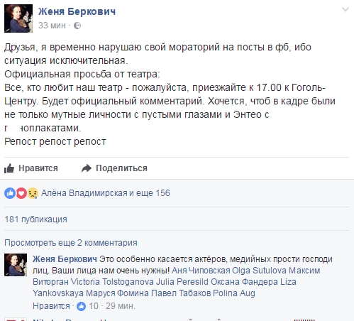 Сотрудники «Гоголь-центра» тем временем призывают к стенам театра «медийных персон» для поддержки художественного руководителя.