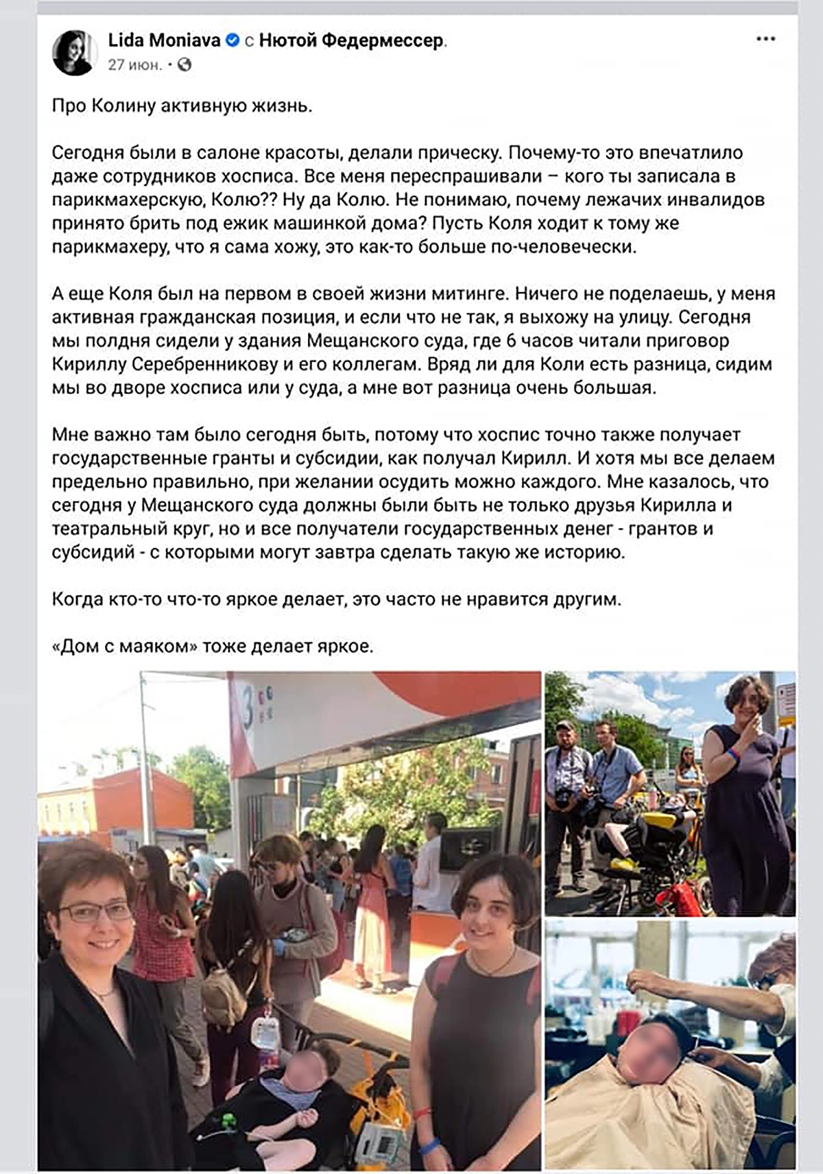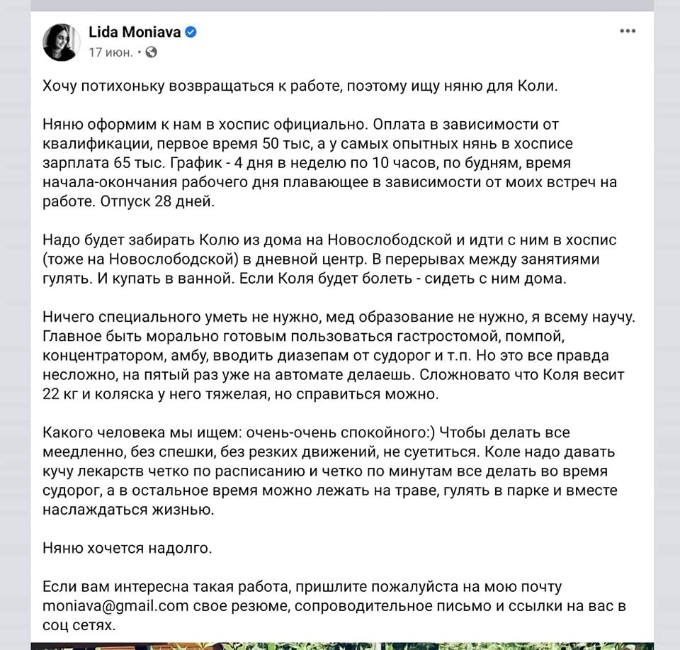 Лида на своих страничках в соцсетях, описывая жизнь с Колей, периодически сбивается на риторические вопросы формата «почему они не», «почему у нас не видно инвалидов». И все бы ничего. Но в тех же соцсетях она публикует объявление о поиске няни для ребенка с зарплатой в 50 тысяч и обещанием оформить ее в «Дом с маяком», рассказ о наличии другой няни и повествует, как Коля находится в центре дневного пребывания в хосписе.