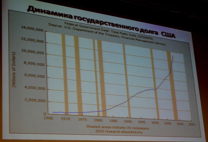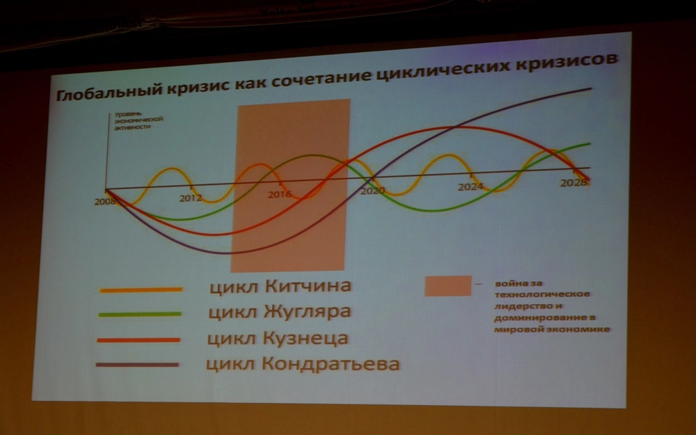 Представив несколько слайдов со схемами и графиками, советник президента России наглядно продемонстрировал, что мировая финансовая система сейчас стоит на пороге назревших новых кризисов — 50-летнего, 100-летнего и 25-летнего, наиболее пострадает же от него американская система.